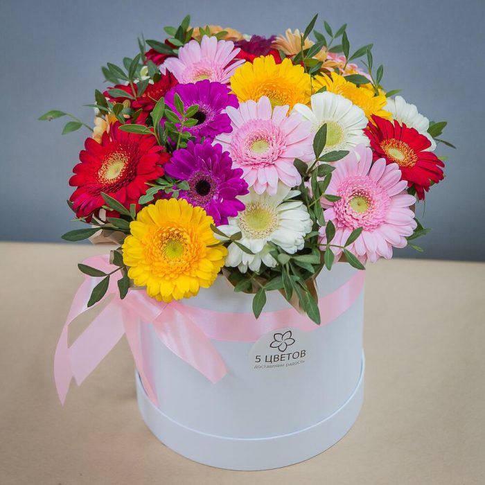 Букет из 25 гербер микс в шляпной коробке