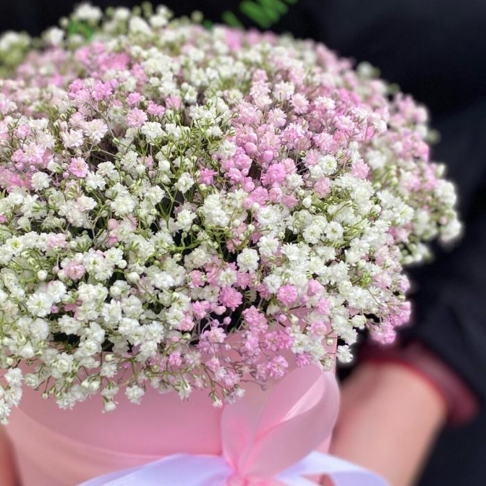 “Сиреневый туман” – композиция из гипсофилы в шляпной коробке