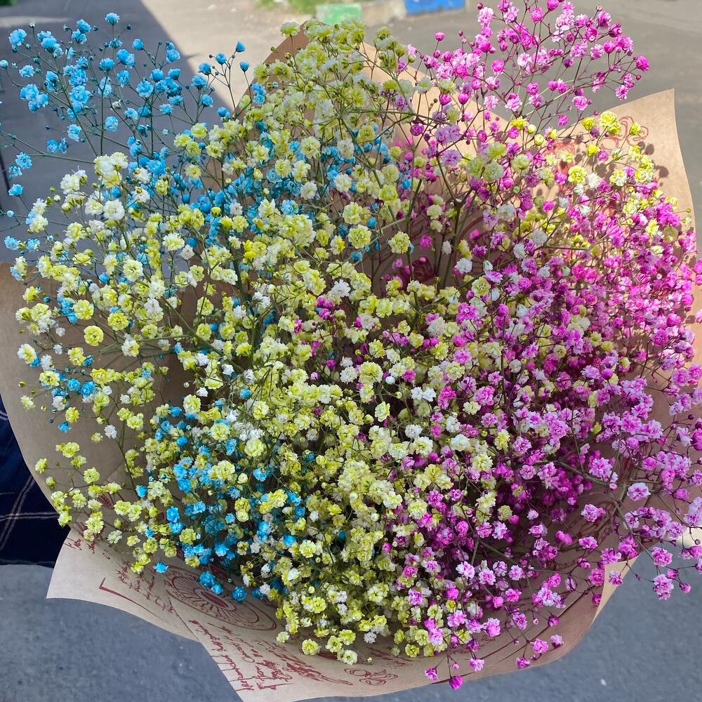Лента атласная – 1 шт.Упаковка крафт – 1 шт.гипсофила радужная – 5 шт.