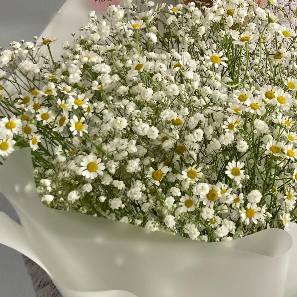 Гипсофила – 5 шт.Упаковка дизайнерская – 1 шт.Матрикария (ромашка) – 7 шт.