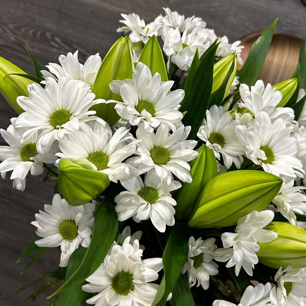 Букет из белой кустовой хризантемы и ароматной белой лилии