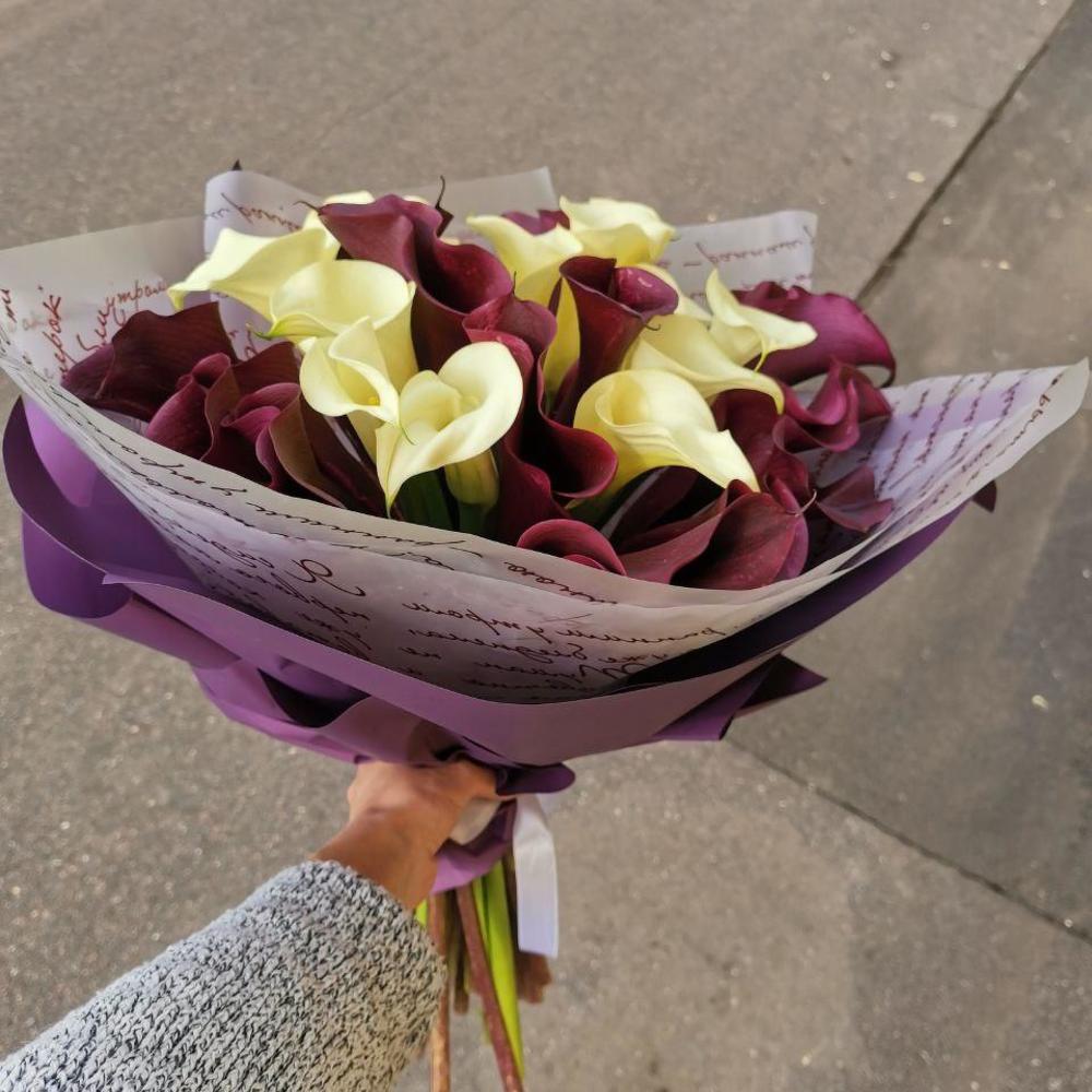 Букет из 25 белых и бордовых калл