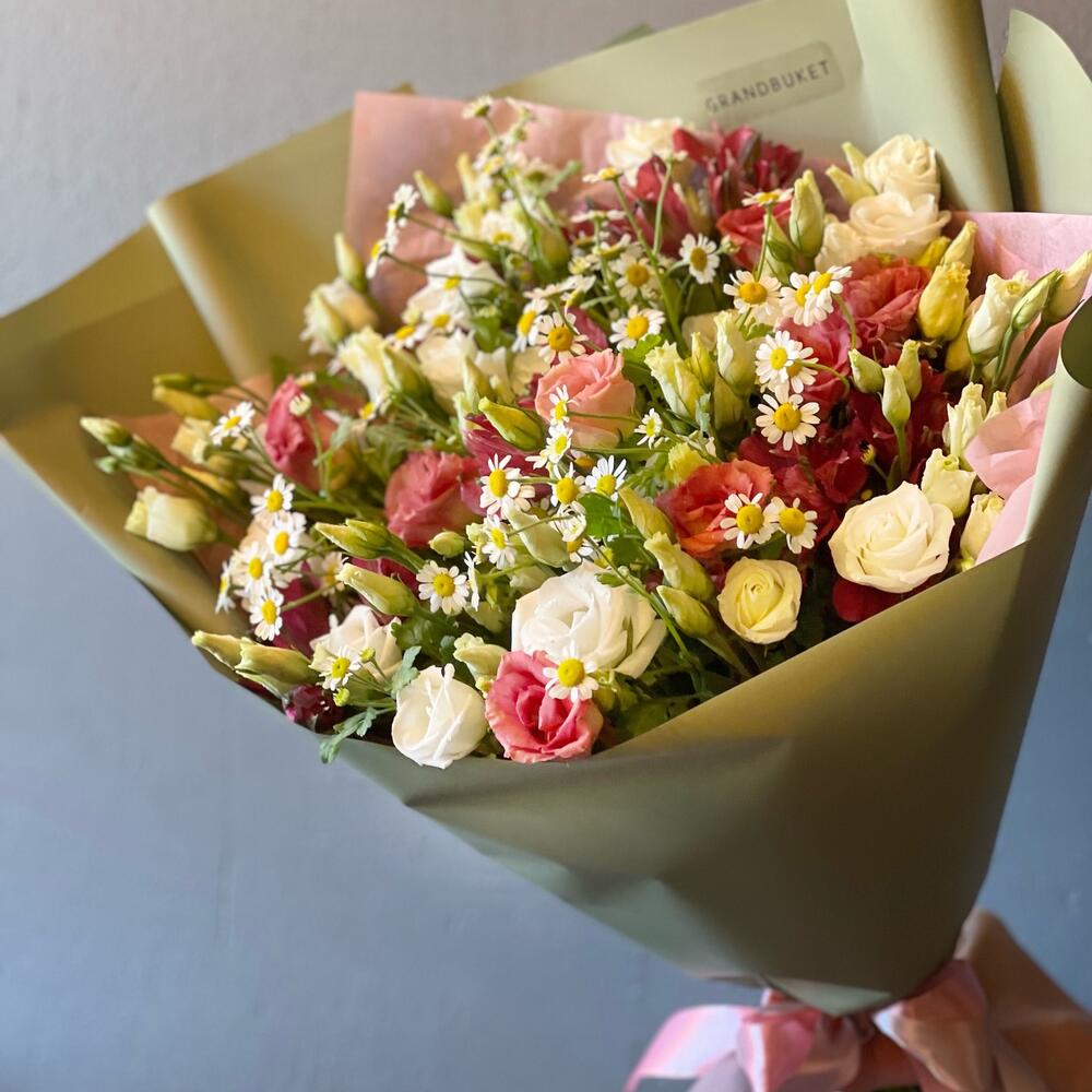 эустома микс – 19 шт.ромашка кустовая мини – 7 шт.Альстромерия – 5 шт.Упаковка дизайнерская – 3 шт.Лента атласная – 3 шт.работа флориста – 1 шт.Тишью – 2 шт.