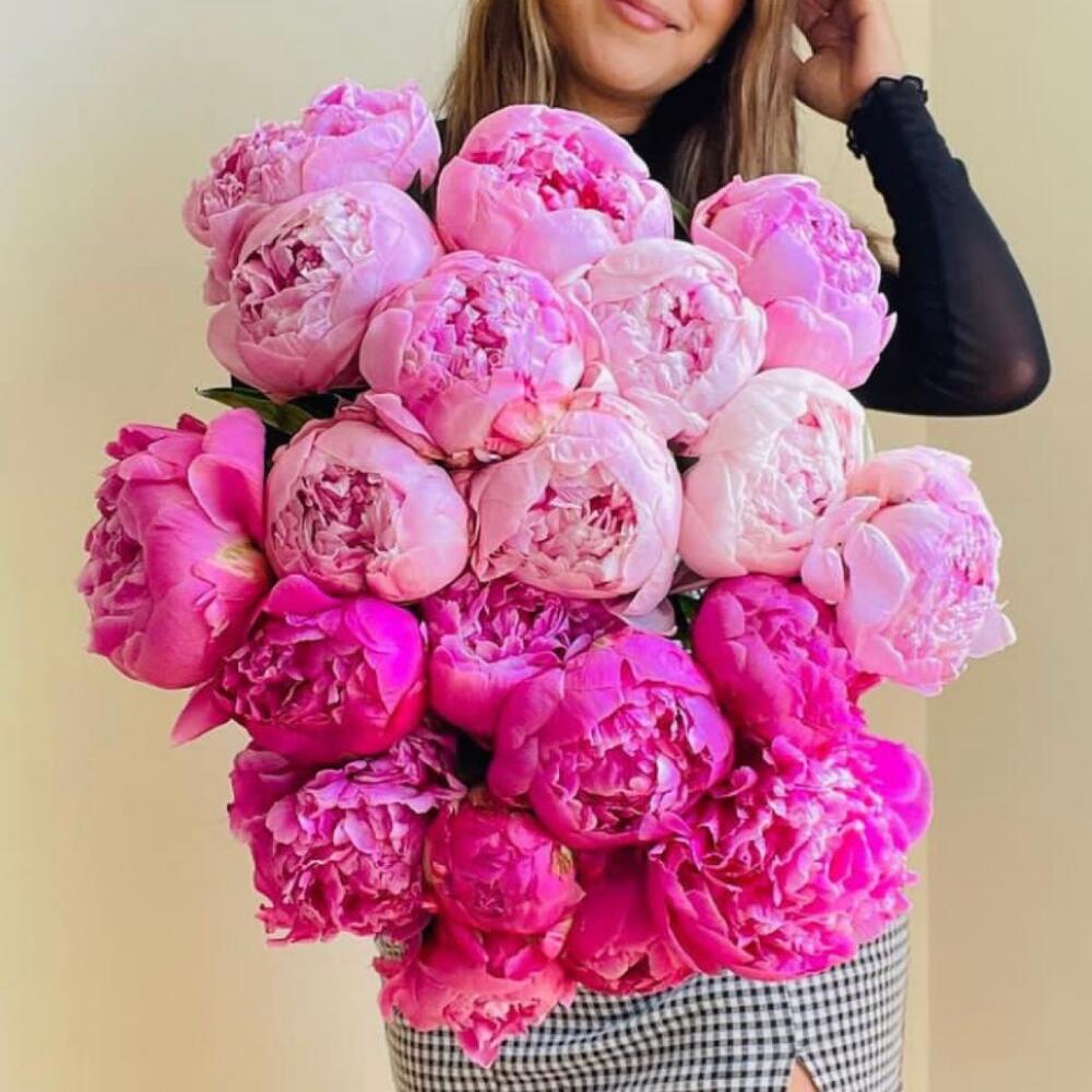 пионы малиновые – 10 шт.пионы розовые – 11 шт.Упаковка дизайнерская – 2 шт.Лента атласная – 2 шт.Открыточка с вашими пожеланиями – 1 шт.инструкция по уходу за цветами – 1 шт.хорошее настроение – 100 шт.