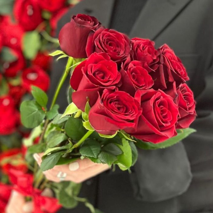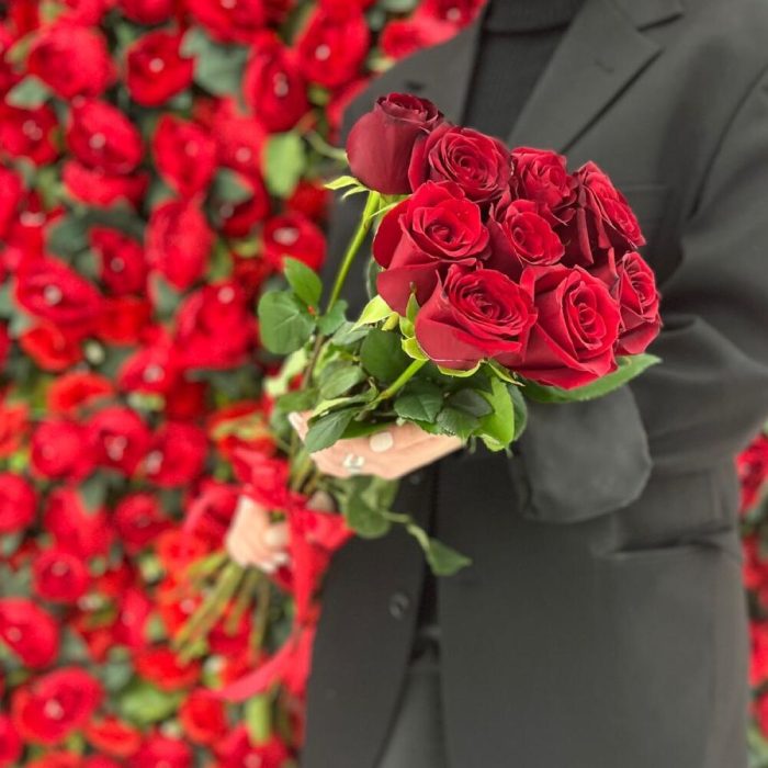 Роза красная – 9 шт. Атласная лента – 1 шт. Открыточка с вашими пожеланиями – 1 шт. инструкция по уходу за цветами – 1 шт.