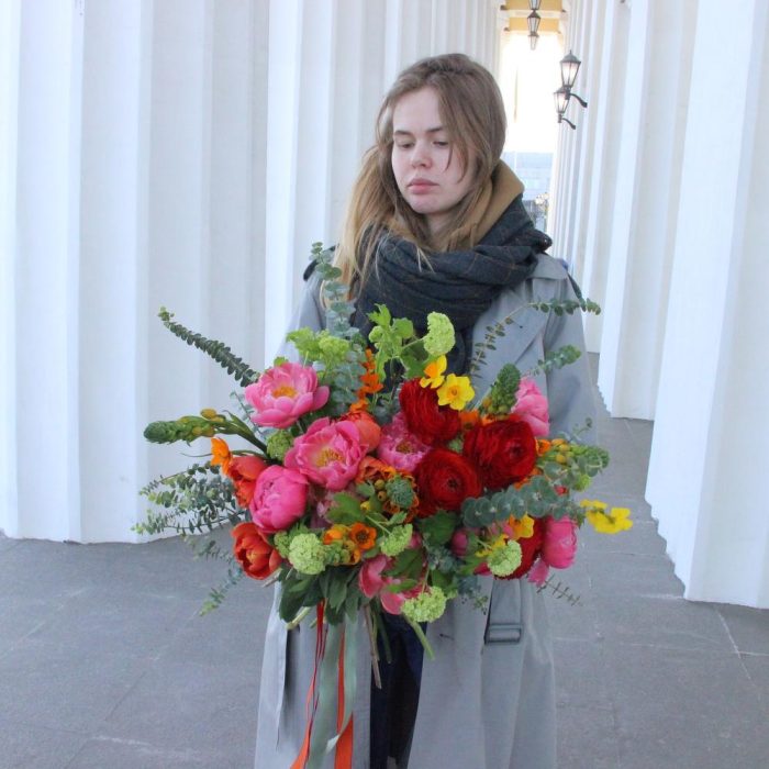 Пион коралл шарм – 5 шт.Орнитогалум – 3 шт.Нарцисс – 5 шт.Тюльпан – 6 шт.Вибурнум – 4 шт.Роза пионовидная – 3 шт.