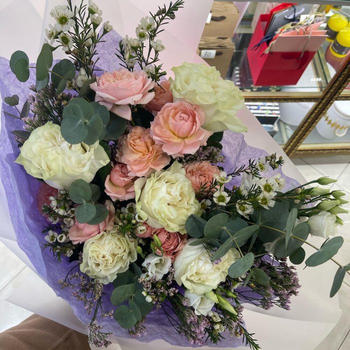 Роза Мондиаль – 5 шт.кустовая роза джульетта – 3 шт.Лимониум – 3 шт.Ваксфлауэр – 3 шт.Эвкалипт – 4 шт.Лизиантус – 1 шт.Упаковка дизайнерская – 2 шт.