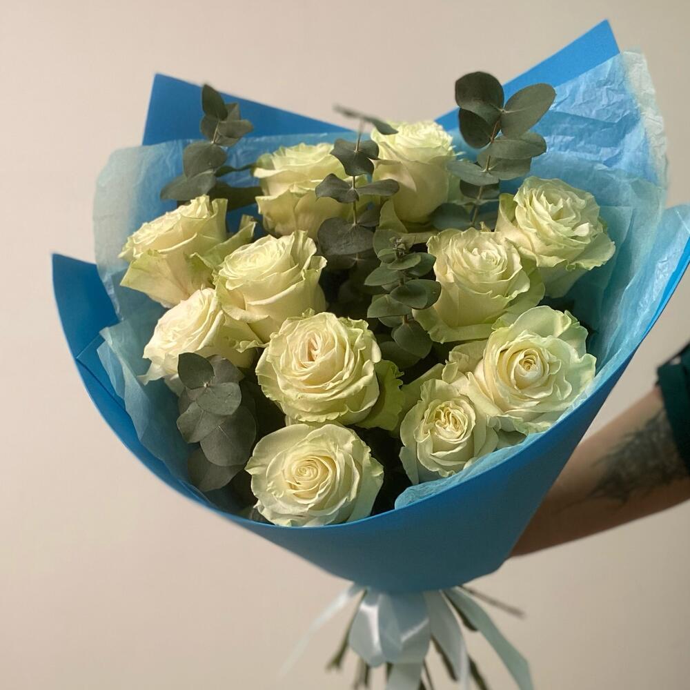 Букет из 11 белых роз и эвкалипта