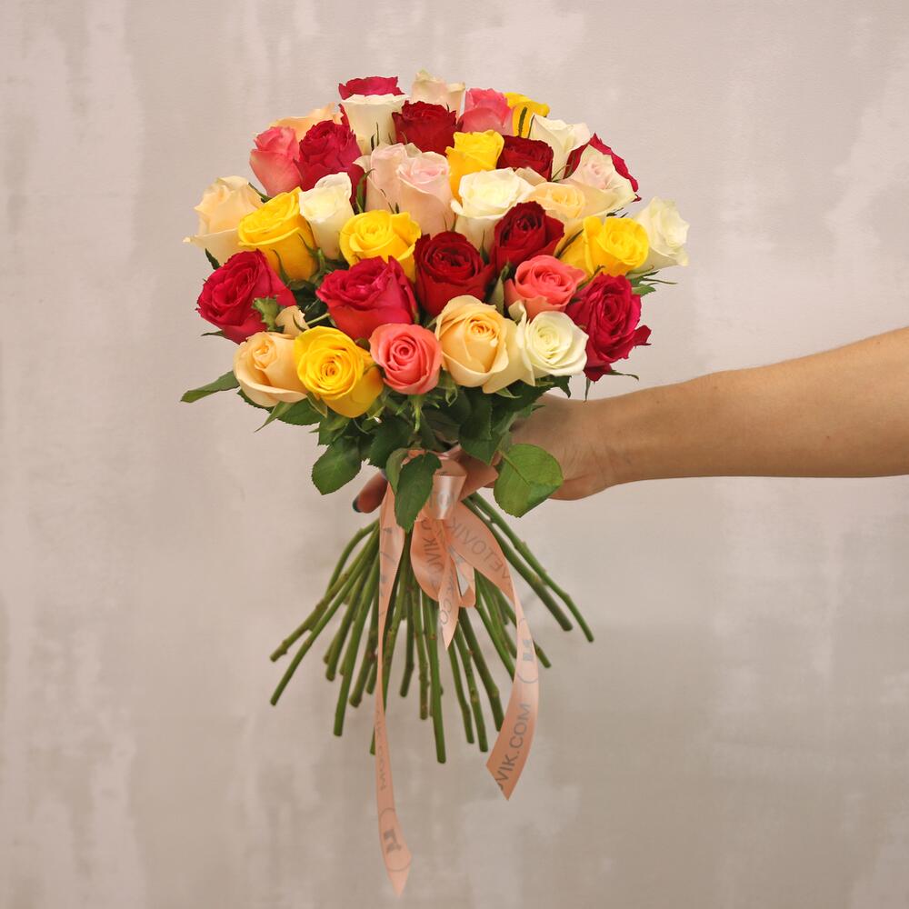 Букет из 35 роз микс 35-40 см (Кения) под атласную ленту