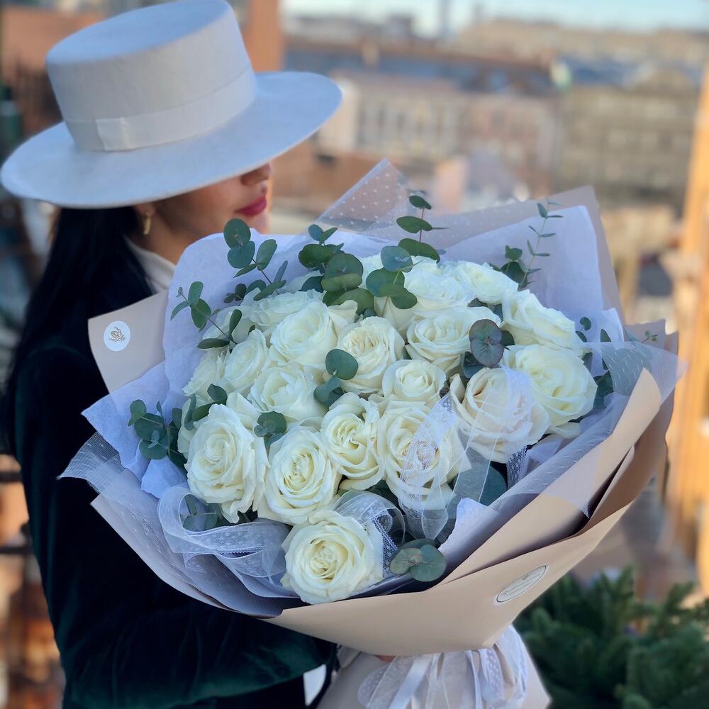 Букет из белых роз с эвкалиптом