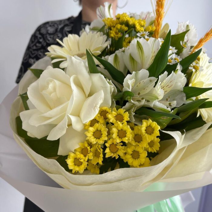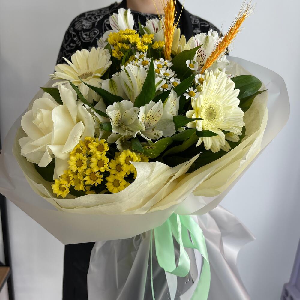 Гербера – 3 шт.Роза – 1 шт.Альстромерия – 3 шт.Сантини – 2 шт.Матрикария – 1 шт.Пшеница (сухоцвет) – 2 шт.Рускус – 5 шт.