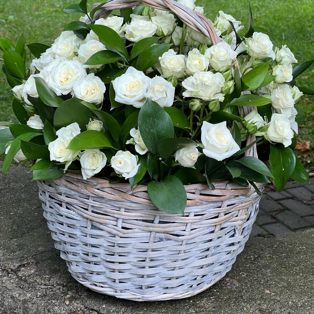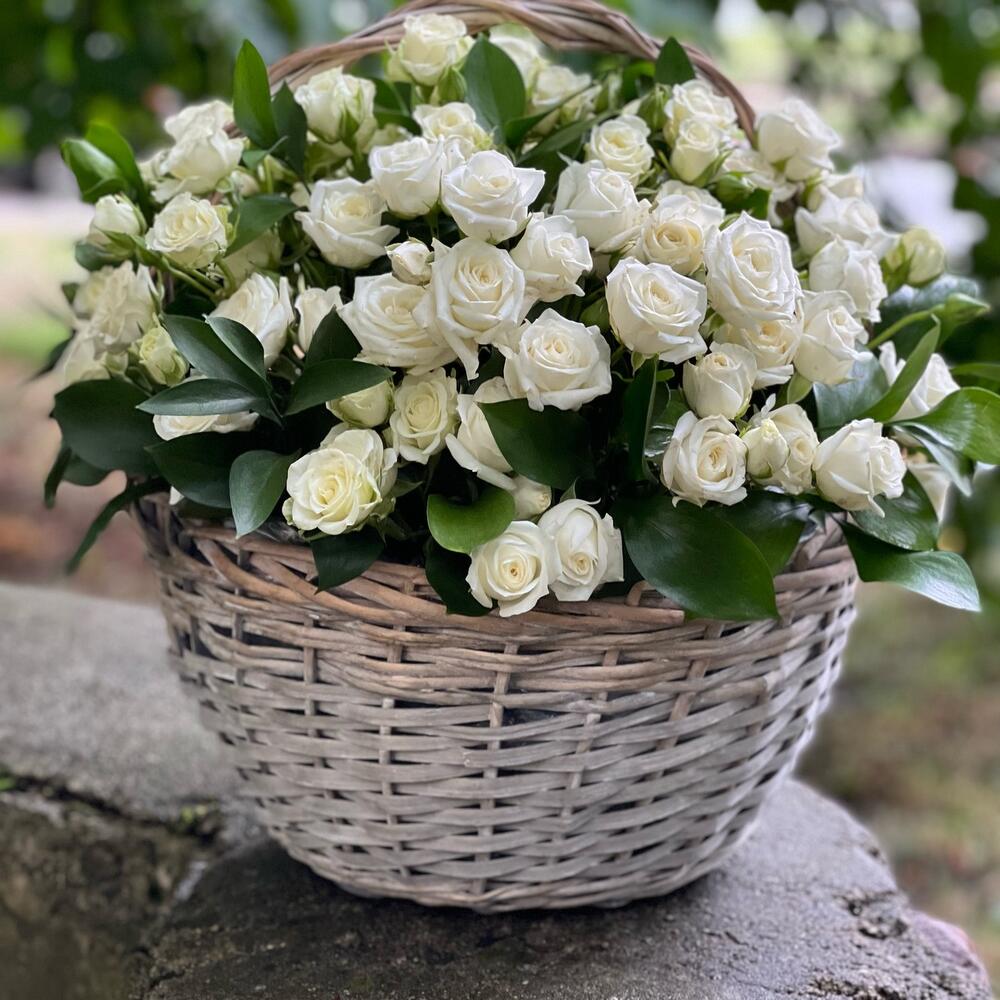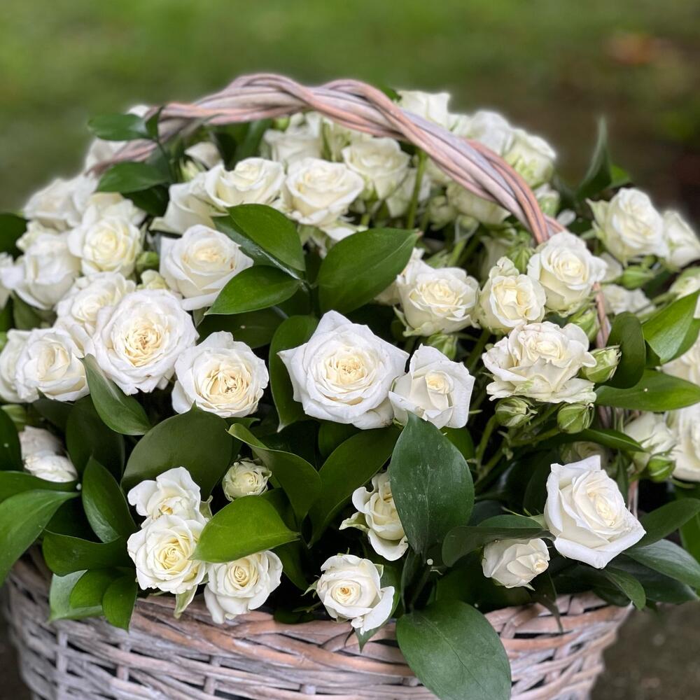 Рускус – 15 шт. Роза кустовая – 25 шт. Корзина плетеная – 1 шт.